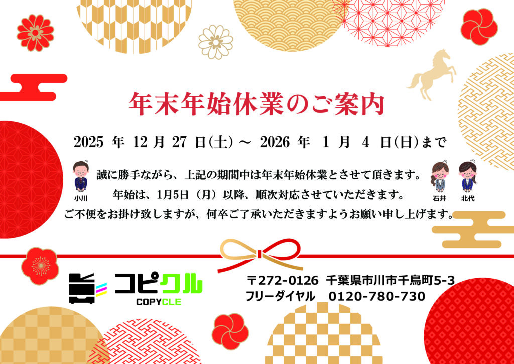平素は格別のご愛顧を賜りまして厚く御礼申し上げます。誠に勝手ながら、12月27日(土)~1月4日(日)を年末年始休業とさせていただきます。なお、1月5日(月)より、通常営業となります。ご不便をお掛け致しますが、宜しくお願い申し上げます。